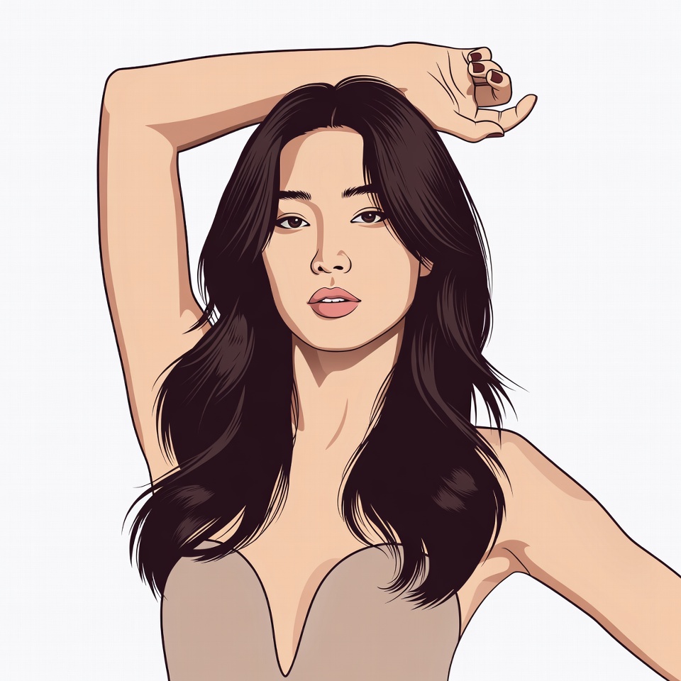 An illustration of an Asian woman with long black wavy hair poses confidently with one arm raised above her head. She wears a low-cut beige sleeveless top that accentuates her figure. Her expression is calm with subtle makeup, set against a plain white background.