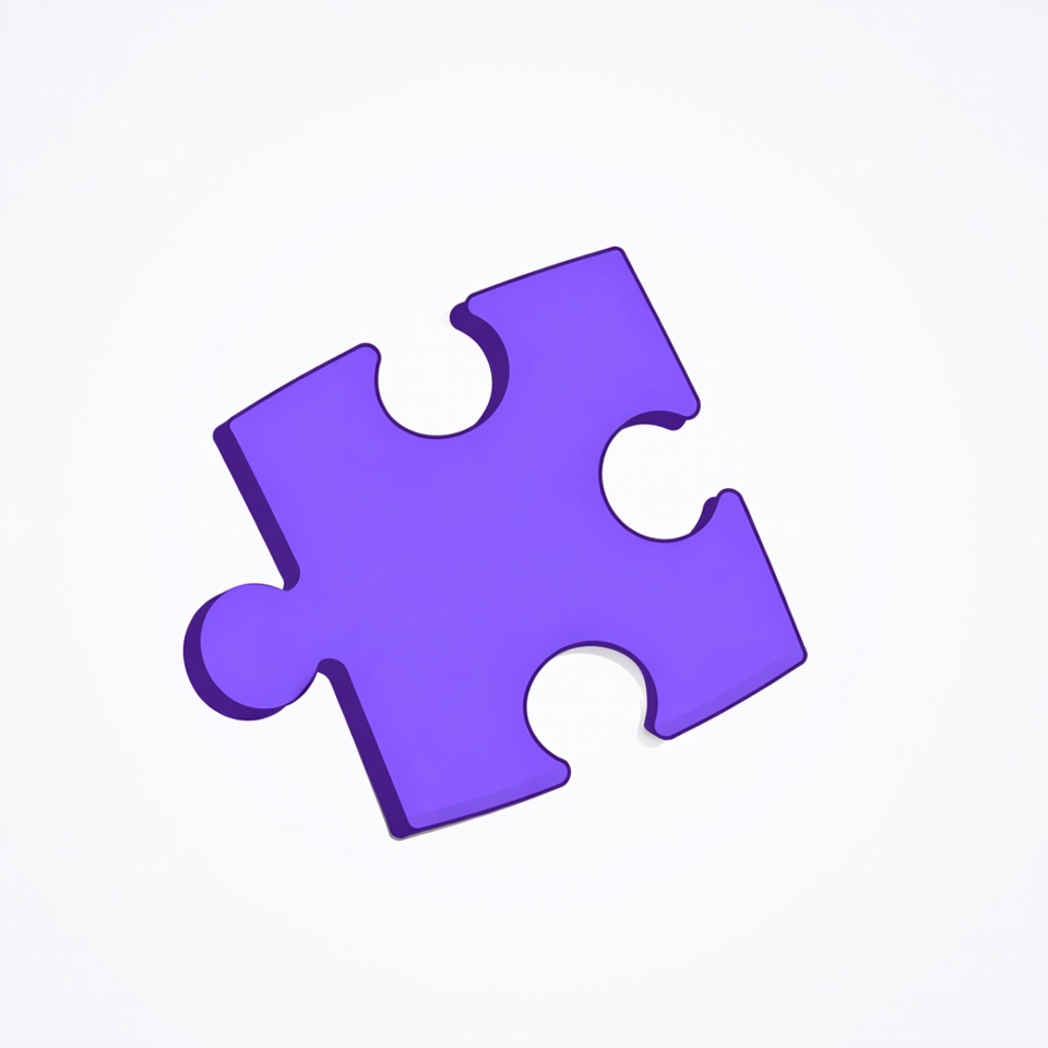 A single purple jigsaw puzzle piece is rendered in 3D with tabs and blanks on a white background. It features a glossy surface and is angled slightly. The piece is centered and isolated for clear visibility.