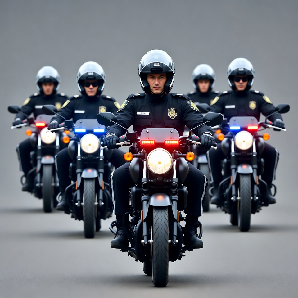 Seven male police officers wearing black uniforms and helmets ride motorcycles in a tight formation. The central officer leads the group with red and blue emergency lights flashing on their bikes. They are positioned against a plain gray background.