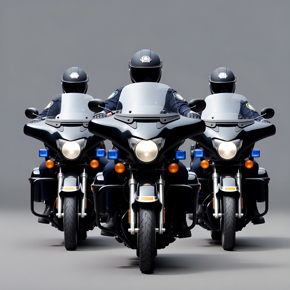 Three police officers wearing helmets and uniforms ride black motorcycles in a tight formation. The bikes feature police lights on the front and sides, positioned against a plain gray background. They face forward with the center bike slightly ahead.