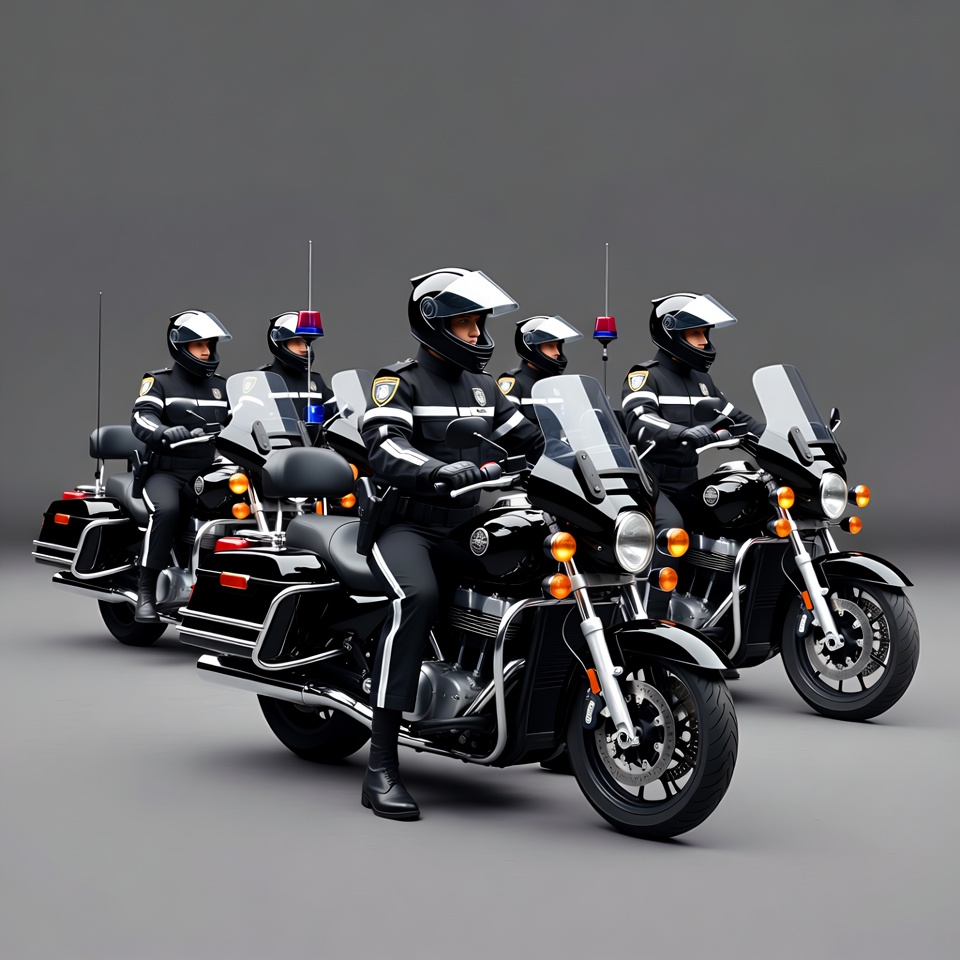 3D render, White, antennas, black uniforms, gray background, group, helmets, illustration, law enforcement, lights, male, motorcycles, officers, patrol motorcycles, police, police bikes, sirens, team, windshields, police officers