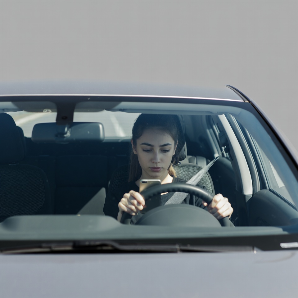 White, car, dark hair, dashboard, distracted driving, driving, female, focused expression, hands on wheel, phone, road safety, seatbelt, smartphone, steering wheel, texting, vehicle interior, windshield, young woman, woman