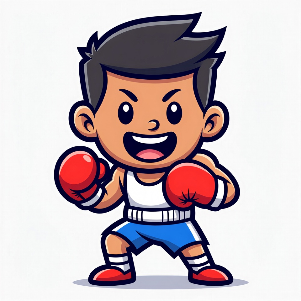 A cute cartoon boy with short dark hair stands in a boxing stance wearing red boxing gloves, a white tank top, blue shorts, and red shoes. He has an excited expression with wide eyes and a big smile. The illustration features bold outlines and vibrant colors on an isolated white background.