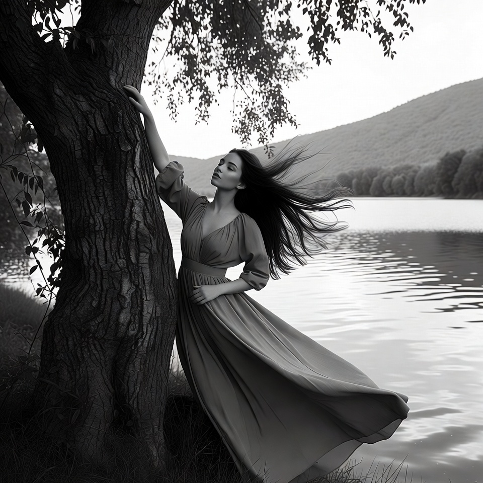 A woman with long flowing hair leans against a large tree trunk while wearing a flowing dress. She stands on grassy ground near a calm lake with mountains in the background. The image is in black and white.