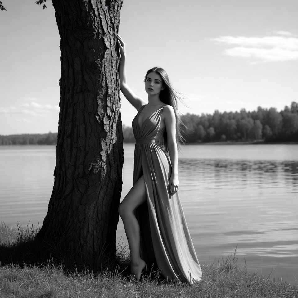 A young woman with long flowing hair leans against a large tree trunk near a calm lake. She wears a sleek, high-slit evening gown that accentuates her pose, with one hand touching the bark and her bare foot on the grass. The black and white image features a forested background and cloudy sky.