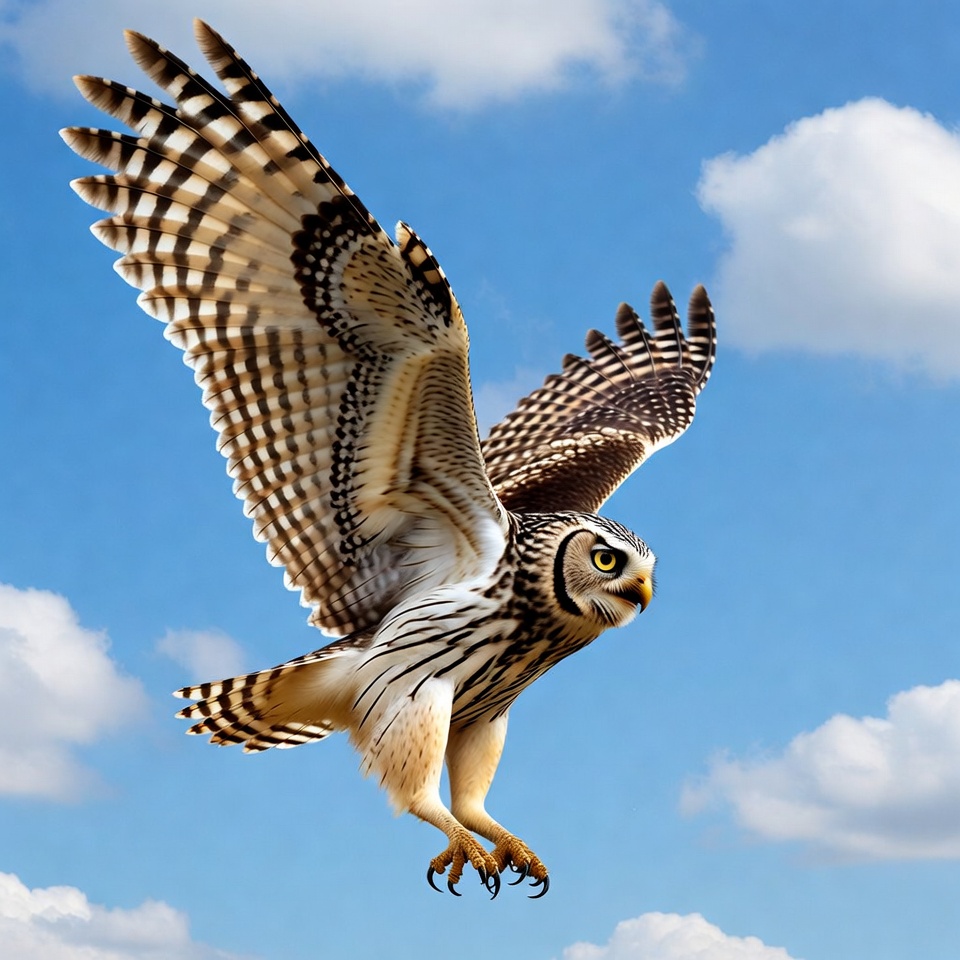 A short-eared owl with brown and white striped feathers flies with wings spread wide against a bright blue sky dotted with white clouds. Its yellow eyes are focused ahead, and talons are extended downward. The detailed plumage shows intricate patterns on wings and body.
