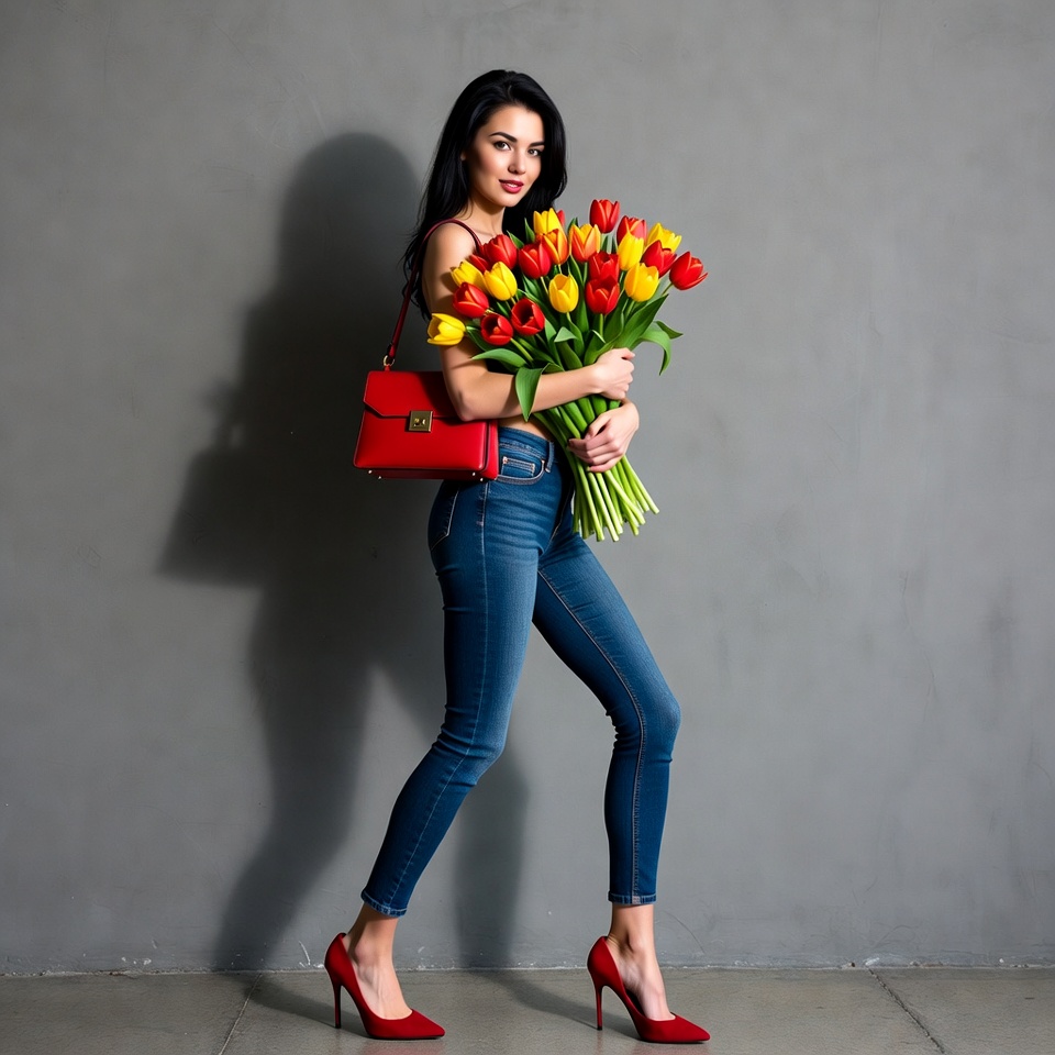A young woman with long dark hair holds a large bouquet of vibrant red tulips in her arms. She wears tight blue jeans, a red shoulder bag, and red high heels while standing against a gray background. She walks gracefully with a subtle shadow behind her.