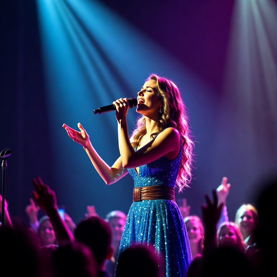 A woman with long wavy hair wears a sparkling blue dress with a brown belt and sings passionately into a microphone on a lit stage. Bright purple and blue spotlights illuminate her as she raises her hands expressively. An enthusiastic crowd of diverse people cheers in the background with hands raised.