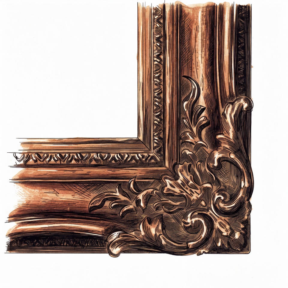An intricate watercolor-style illustration of an empty ornate picture frame with elaborate gold-toned carvings. The frame features swirling floral motifs and detailed scrollwork on a white background. It is depicted from a corner angle, showcasing the decorative borders.