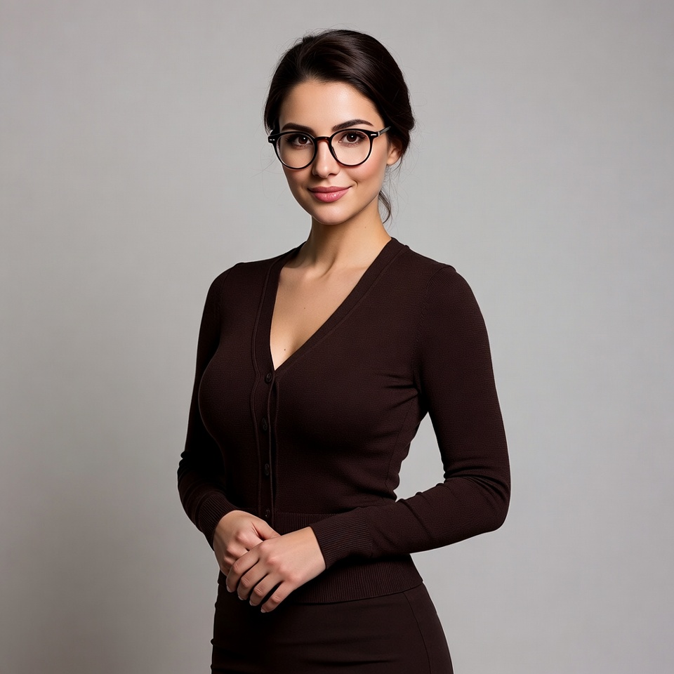 attractive woman, black glasses, brown cardigan, brown hair, dark hair, eyewear, female, glasses, gray background, hands clasped, long sleeve, portrait, professional look, smiling, standing, updo hairstyle, v-neck sweater, young woman, woman