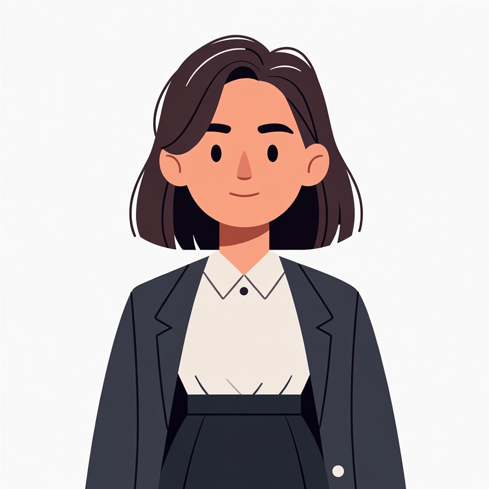 A cartoon illustration of a young woman with shoulder-length dark brown hair smiles at the viewer. She wears a dark blazer over a white collared shirt and matching skirt. The figure stands against a white isolated background.