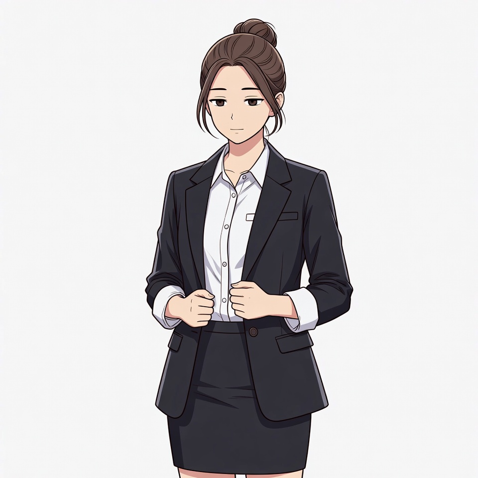 Asian, black blazer, black skirt, brown hair, bun hairstyle, business suit, cartoon character, female, hands clasped, illustration, isolated background, office attire, professional woman, standing pose, white shirt, young woman, anime woman