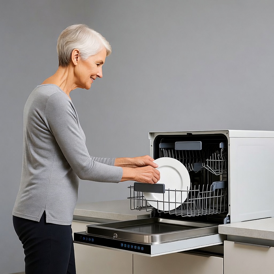 An elderly woman with short white hair stands in a modern kitchen, loading a white plate into an open dishwasher. She wears a gray long-sleeve top and black pants, smiling slightly as she handles the dish. The kitchen features a gray countertop and white cabinets.