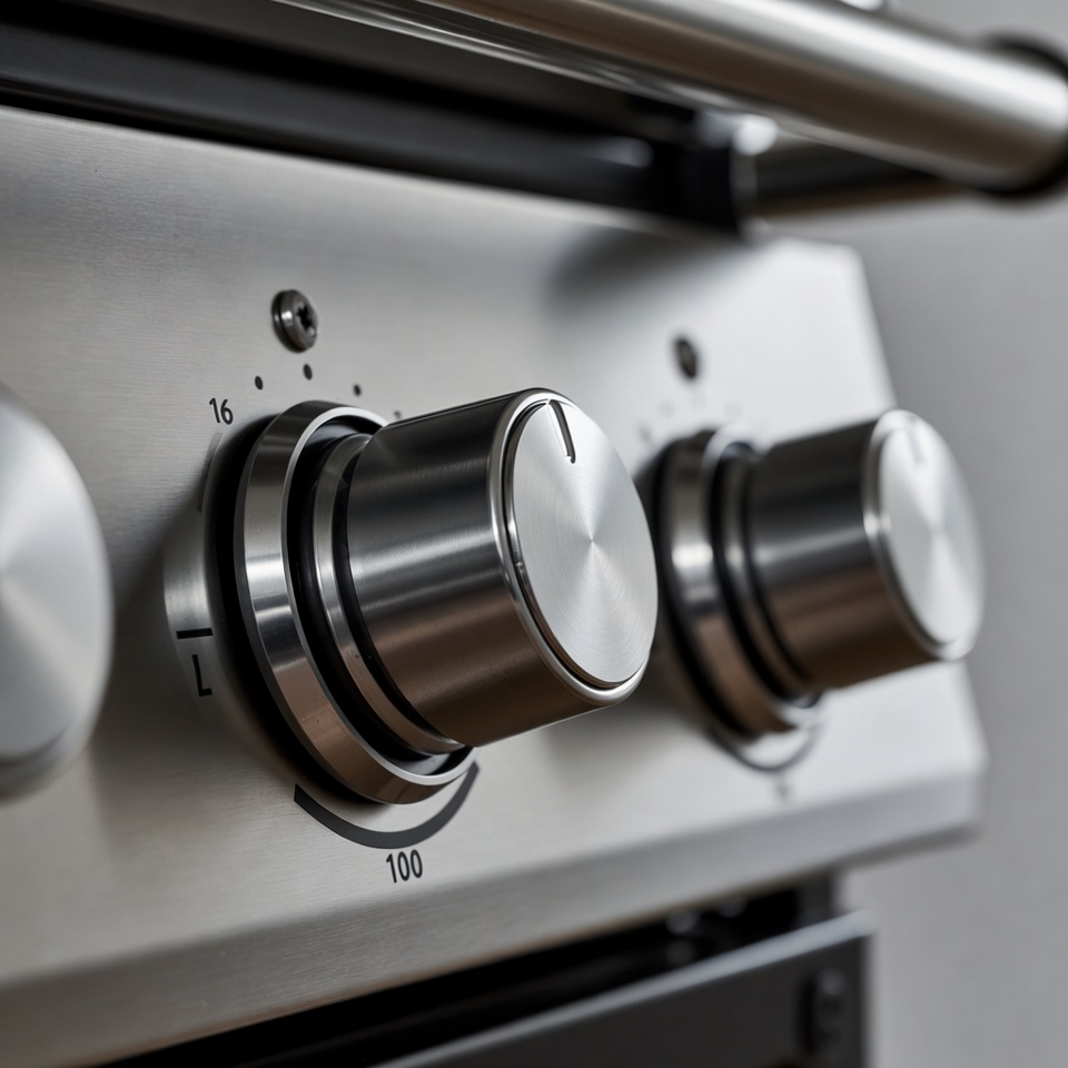 chrome, control knobs, cooking, dial controls, gas range, kitchen appliance, knobs, modern oven, range, stainless steel, stove, temperature knobs, oven