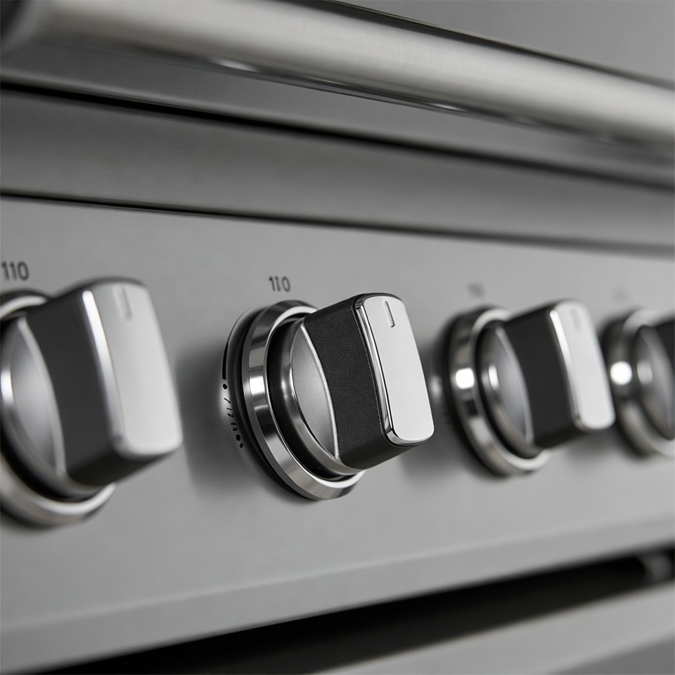 A close-up view of stainless steel stove control knobs on a modern gas range. The black knobs feature white markings like 110 and J, mounted on a shiny metallic panel. Several knobs are aligned horizontally for precise cooking control.