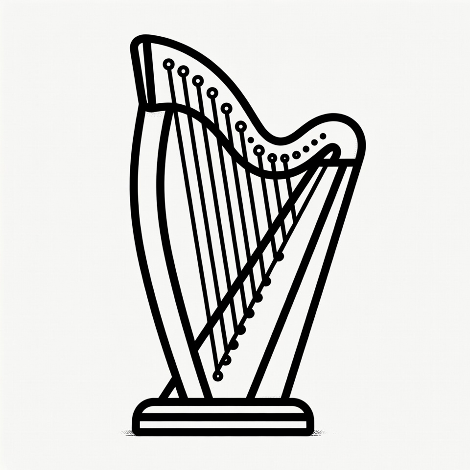 black outline, classical music, clipart, harpist instrument, illustration, isolated background, line art, musical instrument, outline illustration, simple drawing, strings, vector art, white background, harp
