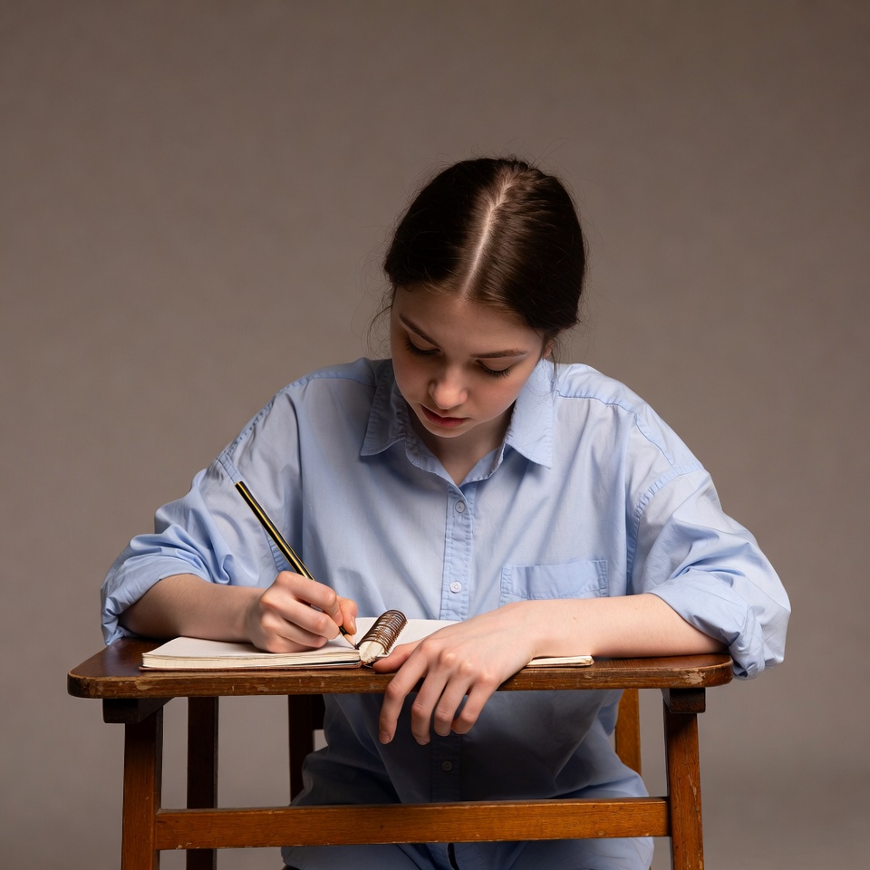 blue shirt, chair, dark hair, desk, female, focused, hand writing, isolated background, notebook, pen, student, studying, wooden desk, writing, young girl, girl