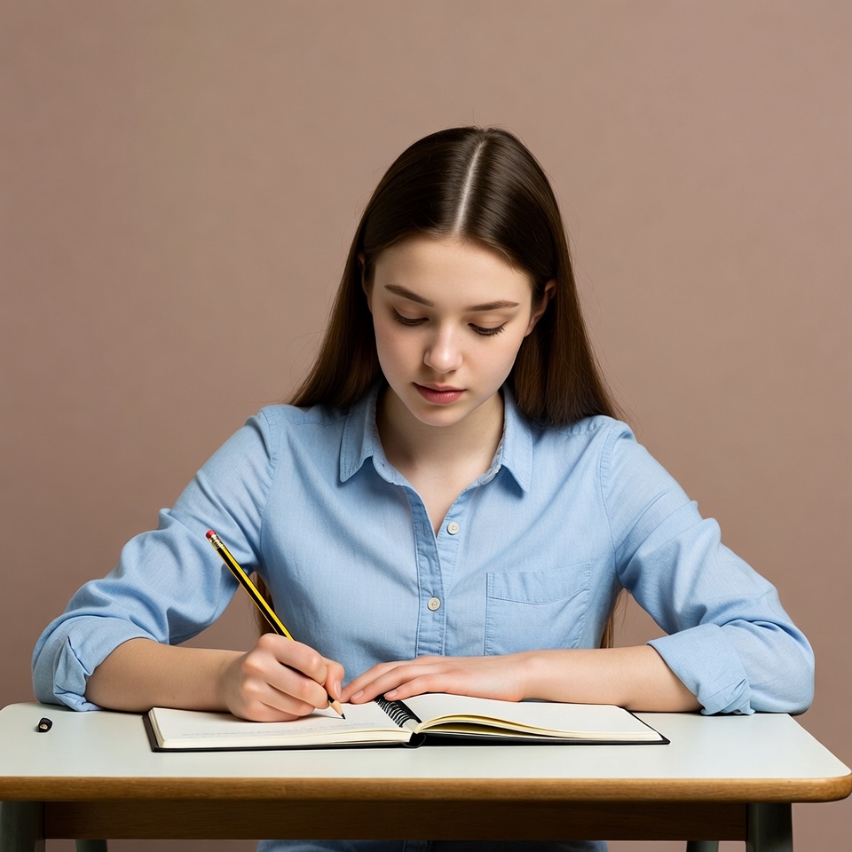 A young girl with long dark hair sits at a wooden desk, writing in an open black notebook with a yellow pencil. She wears a light blue button-up shirt and focuses intently on her task. The background is a plain beige wall.