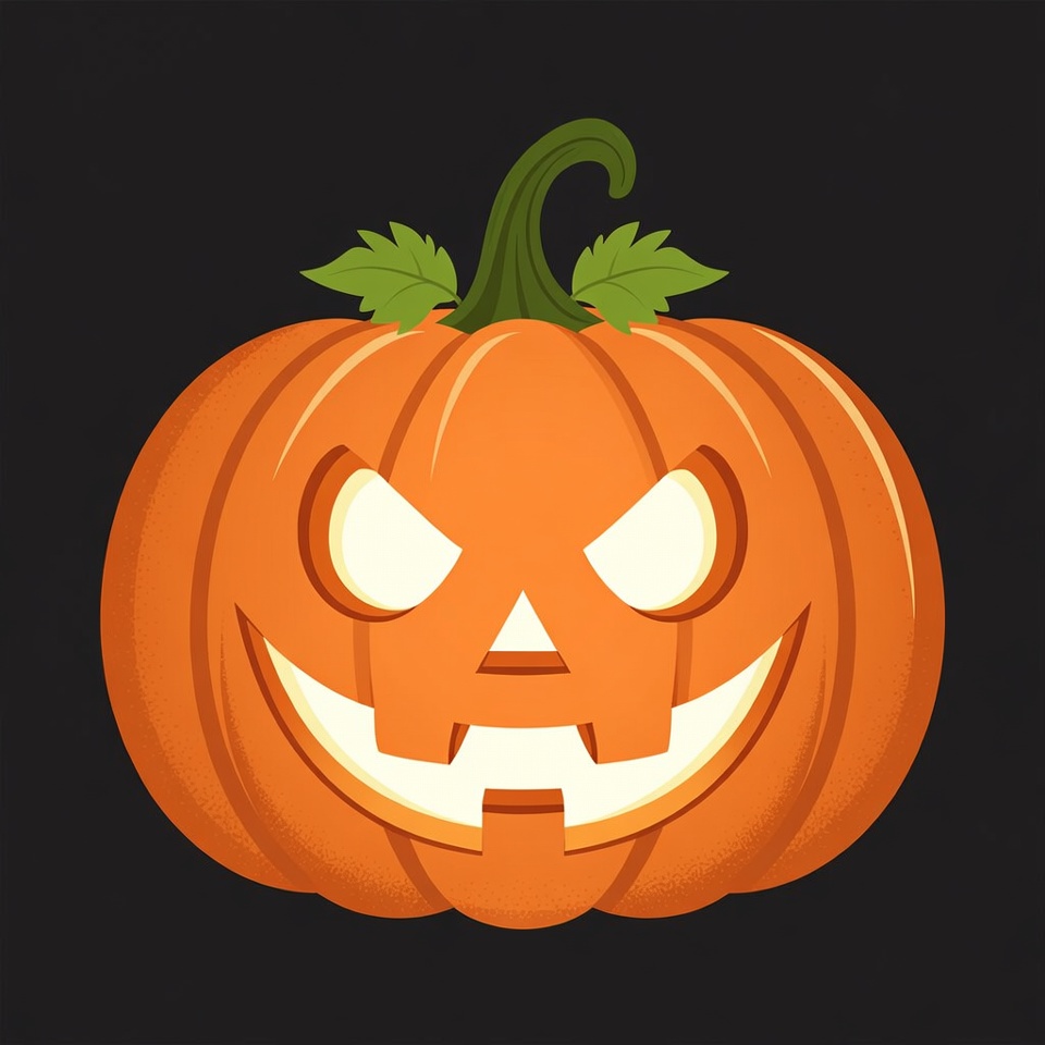 A cartoon jack-o'-lantern pumpkin with glowing white eyes, triangular nose, and jagged smiling mouth sits on a black background. It features a green stem with leaves on top and smooth orange skin. The illustration has a classic Halloween carved face design.