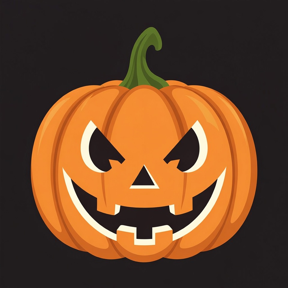A cartoon jack-o'-lantern pumpkin with glowing orange body and green stem sits on a black background. It features menacing black eyes, a triangular nose, and a wide grinning mouth with fangs. The illustration has a flat, colorful vector style perfect for Halloween.