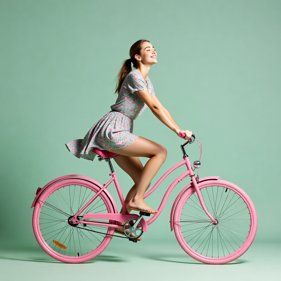 A young woman with long brown hair in a ponytail smiles happily while riding a pink retro bicycle. She wears a short pink floral dress that flutters in the wind, revealing her bare legs and feet. The image is set against a solid mint green background.