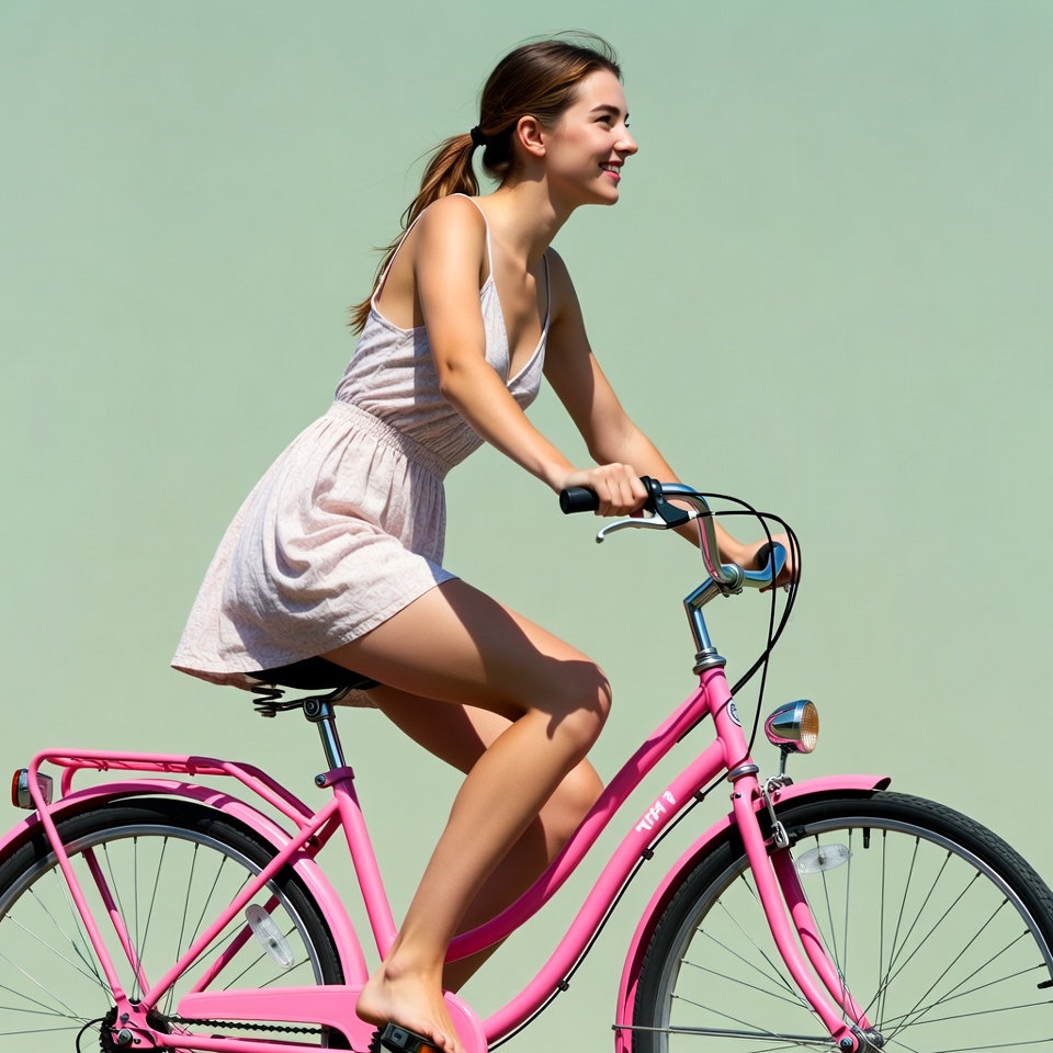 A young woman with brown hair in a ponytail smiles while riding a pink bicycle on a light green background. She wears a short pink dress with thin straps and is barefoot with her legs extended. The bicycle features a front basket, rear rack, and classic design.
