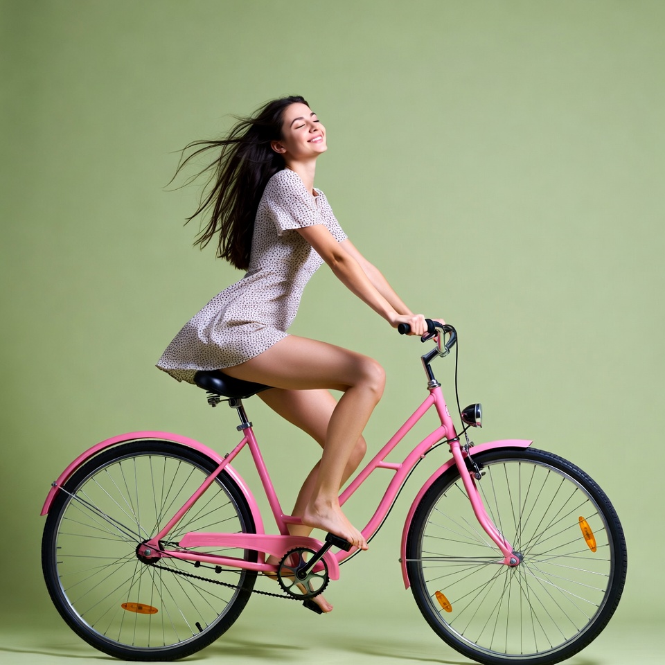 A young woman with long dark hair rides a pink bicycle on a green background. She wears a short white dress, smiles happily with wind blowing her hair, and pedals barefoot. The bicycle features white tires and a classic design.