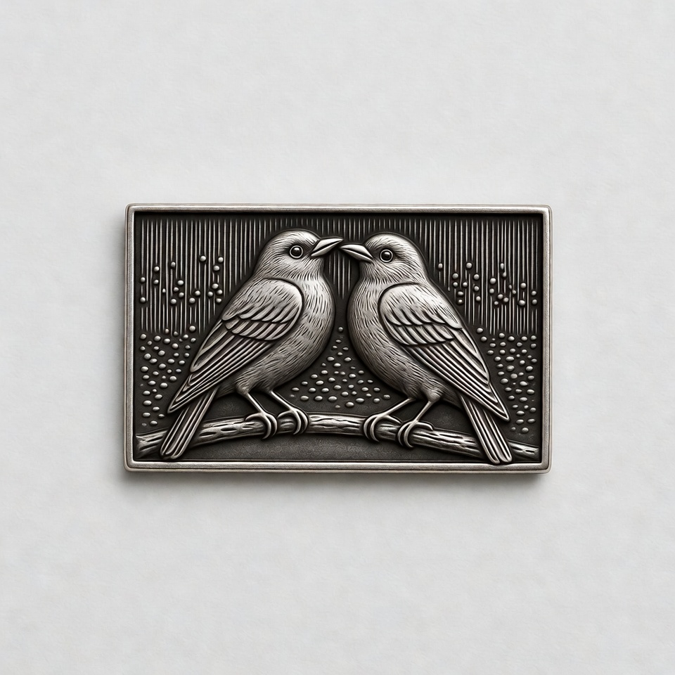 A detailed metallic engraving depicts two small birds facing each other closely on a thin branch. The birds have curved beaks touching and feathers textured with fine lines. The rectangular plaque features a textured background with dotted patterns.