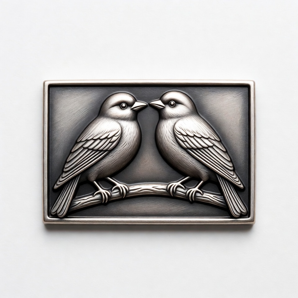 A detailed metallic relief plaque features two small sparrows perched closely together on a thin branch. The birds face each other with beaks touching, rendered in a realistic engraved style with intricate feather details. The rectangular plaque has a neutral gray background.