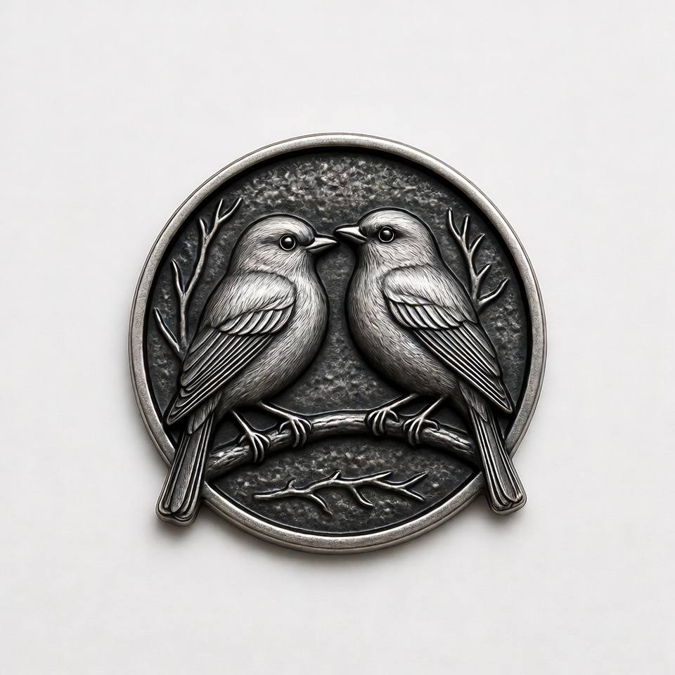 A detailed metallic relief depicts two small gray birds perched closely together on a thin branch within a circular frame. Delicate branches and leaves surround the birds, rendered in a textured silver-toned material. The birds face each other with subtle feathers and expressive eyes.