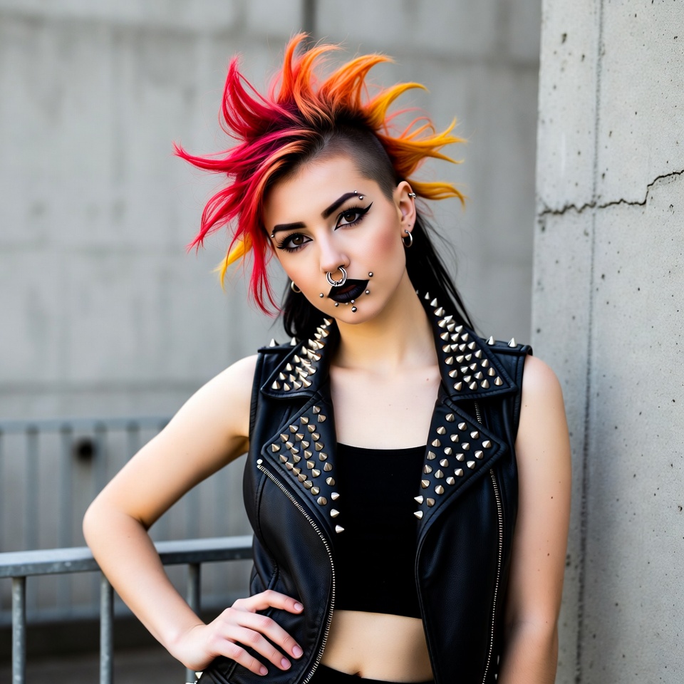 A young woman with a vibrant red and yellow mohawk hairstyle stands confidently against a concrete wall. She wears a black studded leather vest over a cropped top, black lipstick, and a lip piercing. Her makeup is bold with dark eyeliner, and she poses with hands on hips near a metal railing.