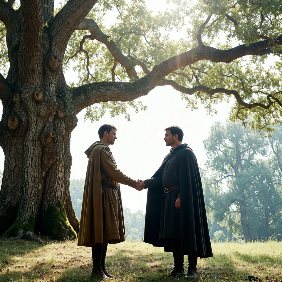 Two men in medieval cloaks stand on grassy ground shaking hands firmly in front of a large ancient oak tree. One wears a brown hooded cape with a belt, while the other dons a black cape. Sunlight filters through the tree's branches and surrounding forest in the background.
