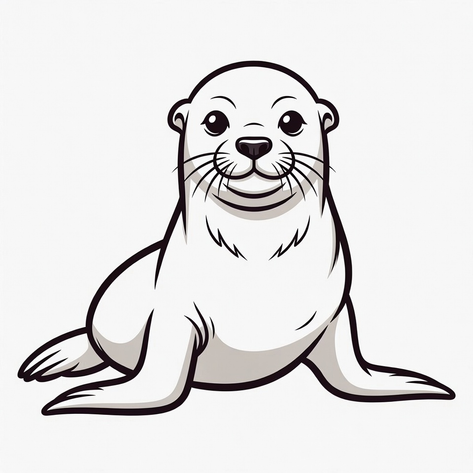 animal illustration, baby seal, big eyes, black outline, cartoon seal, clipart, cute seal, flippers, happy seal, isolated background, line art, sea mammal, smiling seal, vector art, whiskers, wildlife, seal