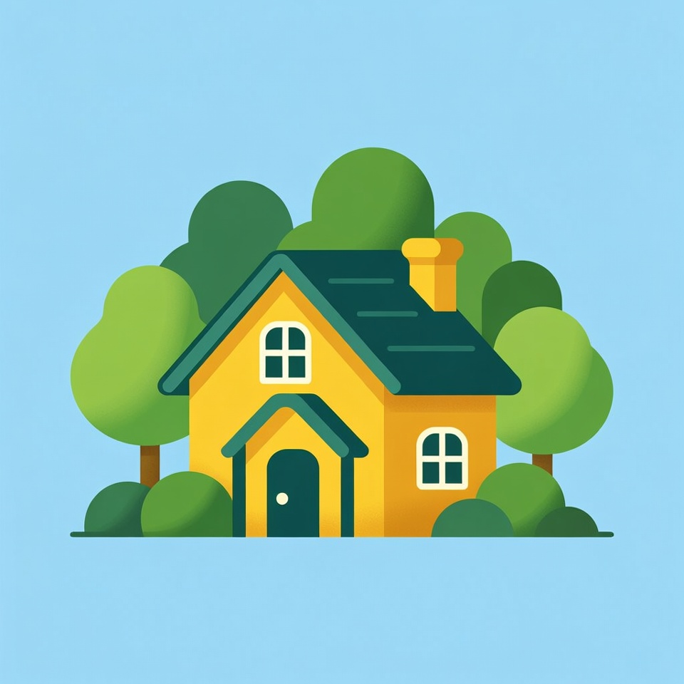 A simple illustration of a yellow house with a green roof and chimney sits on a blue background. It is surrounded by lush green trees and bushes. The house features white windows and a dark green front door.