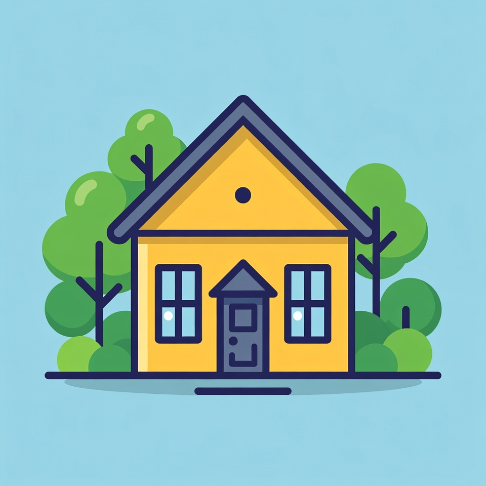 A simple yellow house with a dark roof and windows stands on a blue background. Green trees surround the house on both sides. The image is a flat illustration with bold outlines.