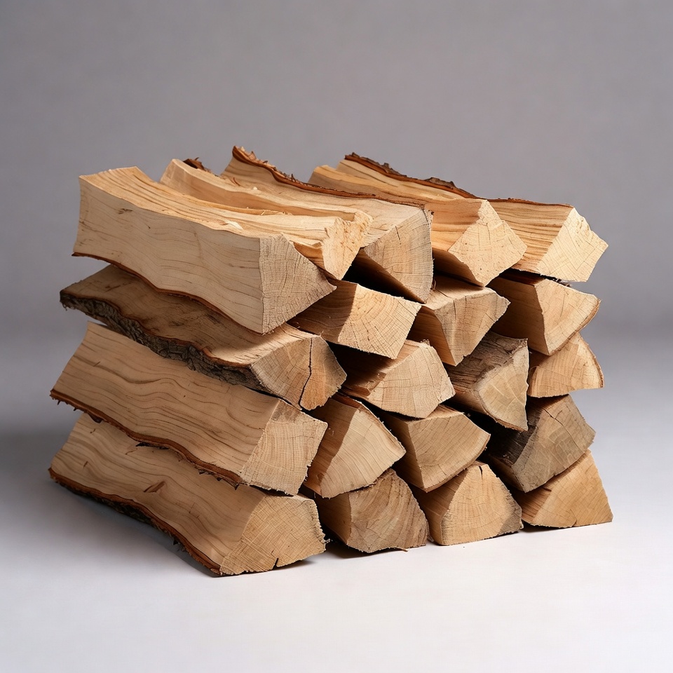A tall stack of split firewood logs is arranged neatly on a plain white background. The light-colored wood shows fresh cut surfaces and natural bark edges. The logs are piled in a stable pyramid shape.