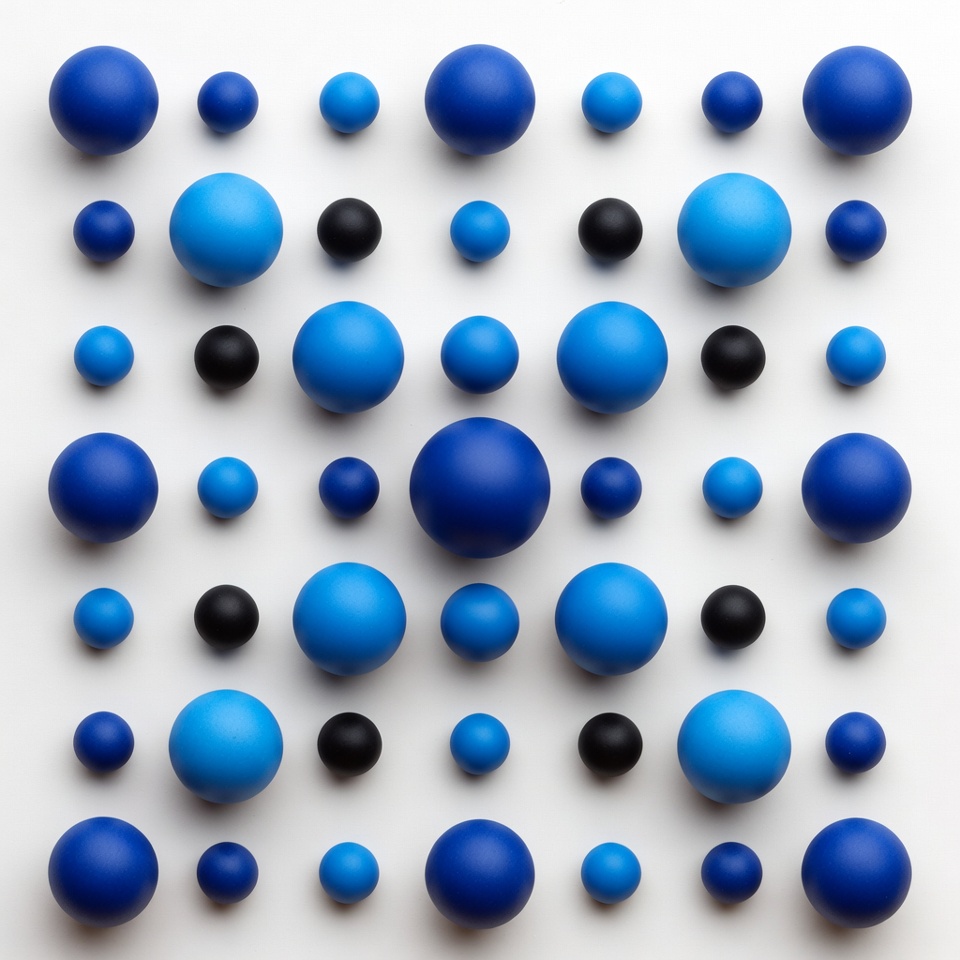 arrangement, black balls, black spheres, blue spheres, colorful spheres, flat lay, geometric pattern, glossy balls, marbles, pattern, round objects, shiny balls, spheres, toy balls, white background, blue balls