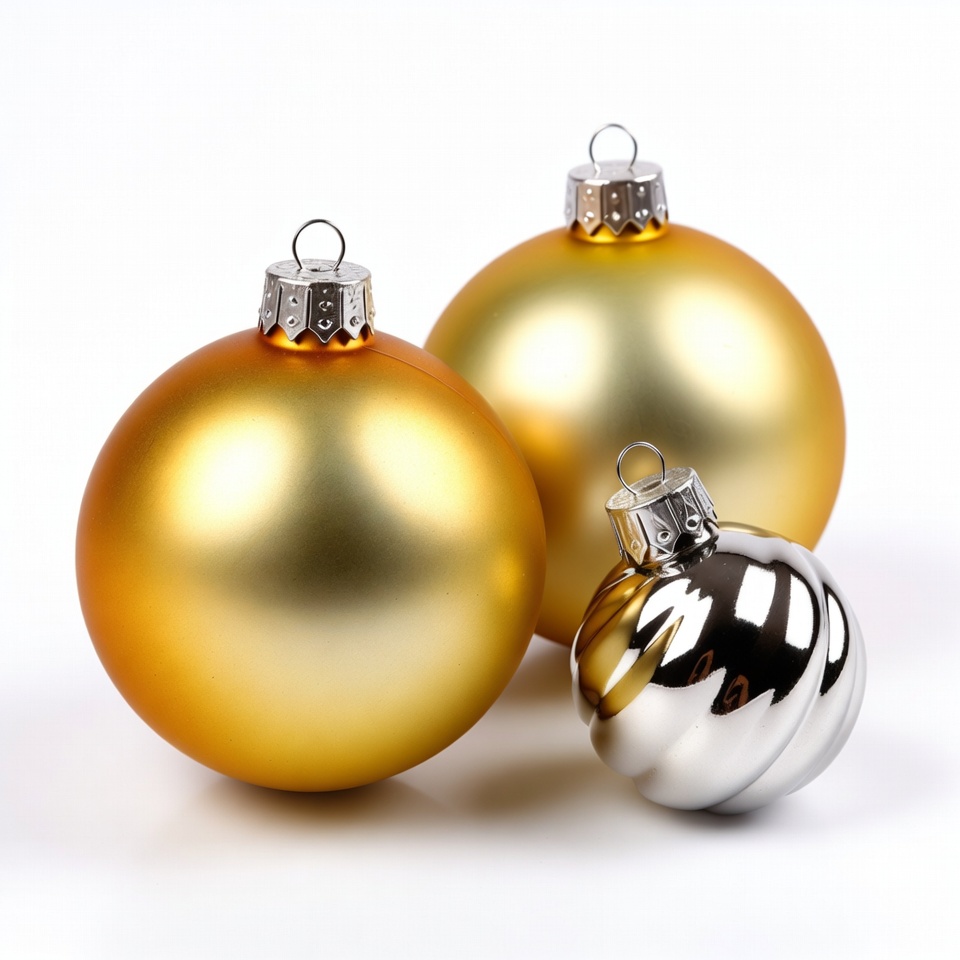 Three shiny Christmas baubles are arranged on a white background. Two large gold ornaments and one smaller silver ornament with a swirled design hang from metal hooks. They reflect light with a glossy metallic finish.