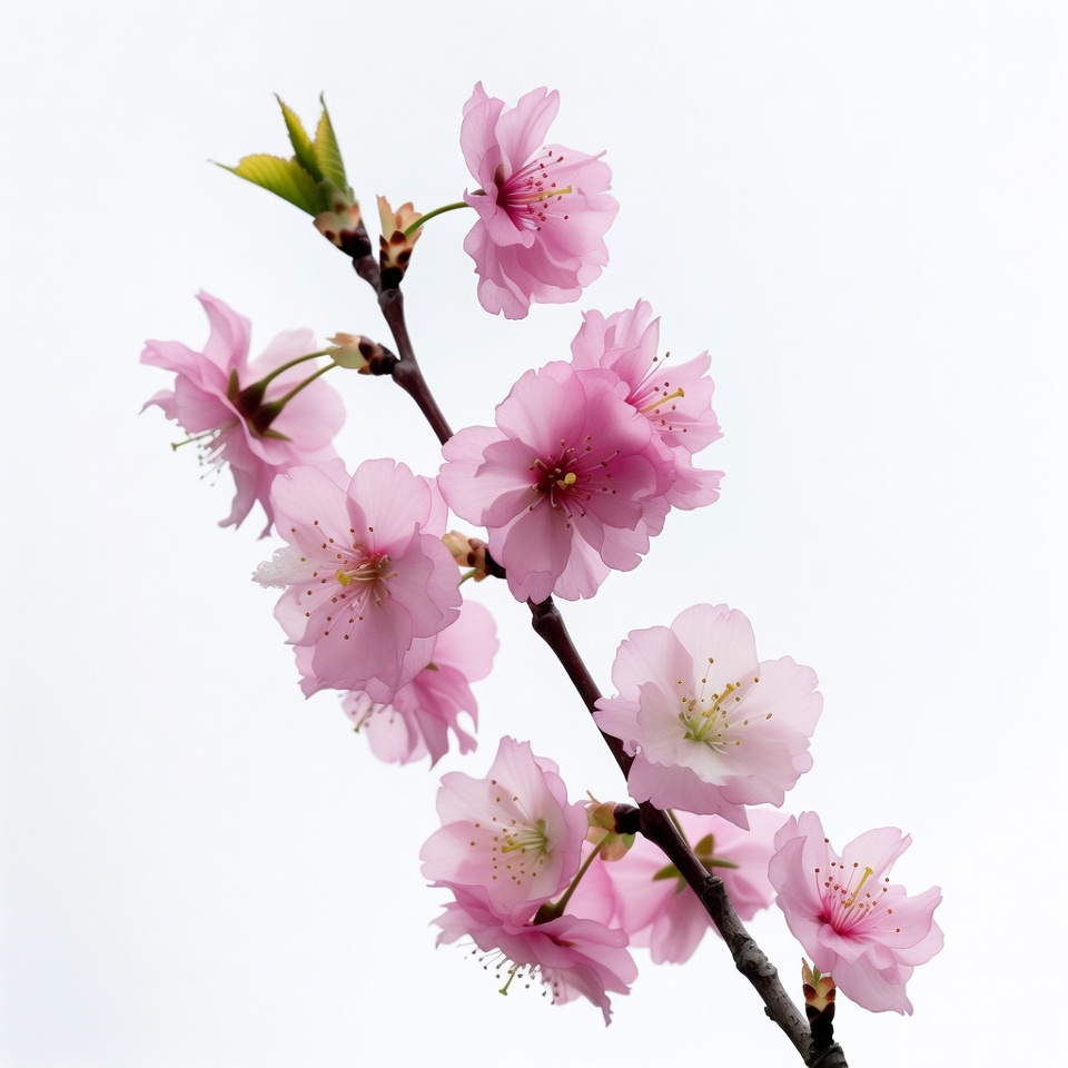 A cluster of delicate pink cherry blossom flowers blooms along a slender brown branch with green leaves. The flowers feature soft pink petals and yellow stamens, arranged in a diagonal composition. The branch is isolated against a plain white background.