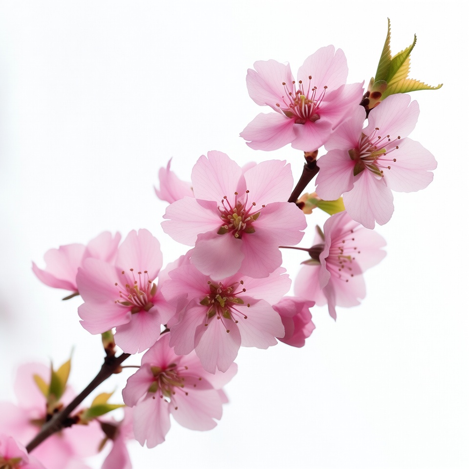 A cluster of delicate pink cherry blossom flowers blooms along a thin branch with green leaves. The petals feature pink hues and visible stamens, set against a plain white background. The arrangement appears fresh and isolated for close-up viewing.