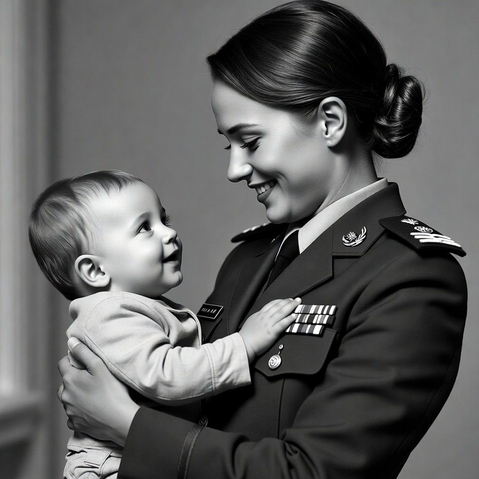 A woman in a military uniform with her hair in a bun holds a smiling baby boy close to her face. She smiles warmly at the infant, who gazes back with a joyful expression. Both are captured in a black and white photograph against a plain background.