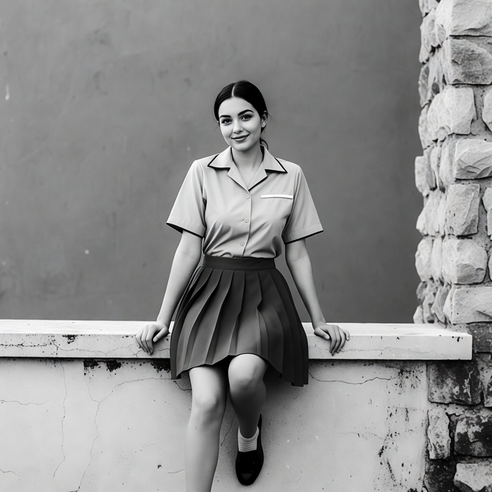 Asian, architecture, black and white, collared shirt, female, happy expression, legs dangling, low wall, monochrome photo, outdoor, pleated skirt, ponytail, school uniform, schoolgirl, short sleeves, sitting, smiling, stone wall, young woman, girl