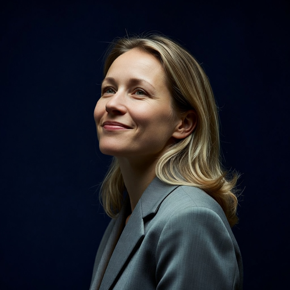 A woman with blonde wavy hair smiles gently while looking to the side against a dark blue background. She wears a gray blazer that fits snugly over her shoulders. Her expression is warm and her face is softly lit.