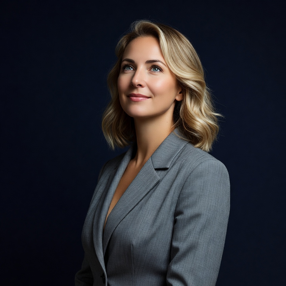 A woman with shoulder-length blonde hair stands in profile against a dark blue background. She wears a gray blazer with a deep V-neckline and gazes slightly upward with a subtle smile. Her expression is confident and poised.