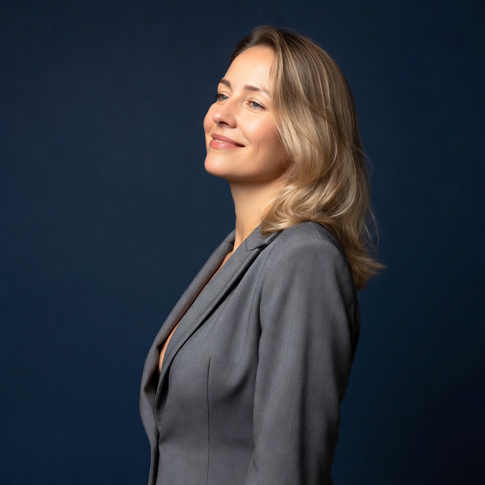 V-neck, blazer, blonde hair, business attire, confident pose, dark blue background, gentle smile, gray suit, headshot, portrait, professional woman, profile view, shoulder-length hair, side profile, smiling, white woman, woman