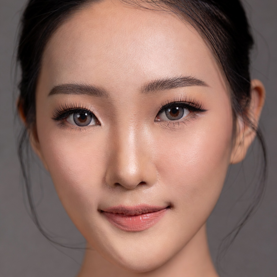 A young Asian woman with long black hair styled in an updo gazes directly at the camera. She has almond-shaped brown eyes enhanced with eyeliner and mascara, smooth fair skin, and glossy pink lips forming a subtle smile. The image is a tight headshot on a plain gray background.