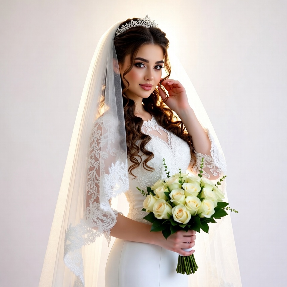 A beautiful bride with long wavy hair and a sparkling tiara stands in a white wedding gown with lace sleeves. She holds a bouquet of white roses and greenery in her hands, with a long veil draped over her head. Her makeup is elegant, and she poses gracefully against a plain white background.