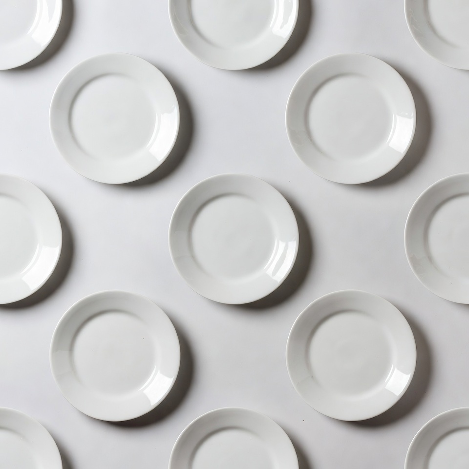 A seamless pattern of multiple white plates arranged in a grid on a plain white background. Each plate is round, empty, and glossy, creating a uniform and symmetrical design. The composition features overlapping and evenly spaced plates for a repetitive texture.