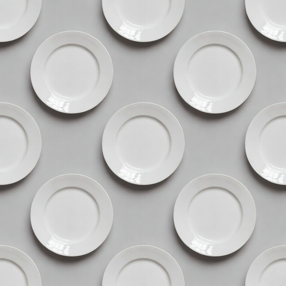 A seamless pattern of multiple white plates arranged in a grid on a gray background. Each plate is round, clean, and empty with a glossy finish. The plates are evenly spaced, creating a repeating texture suitable for backgrounds.