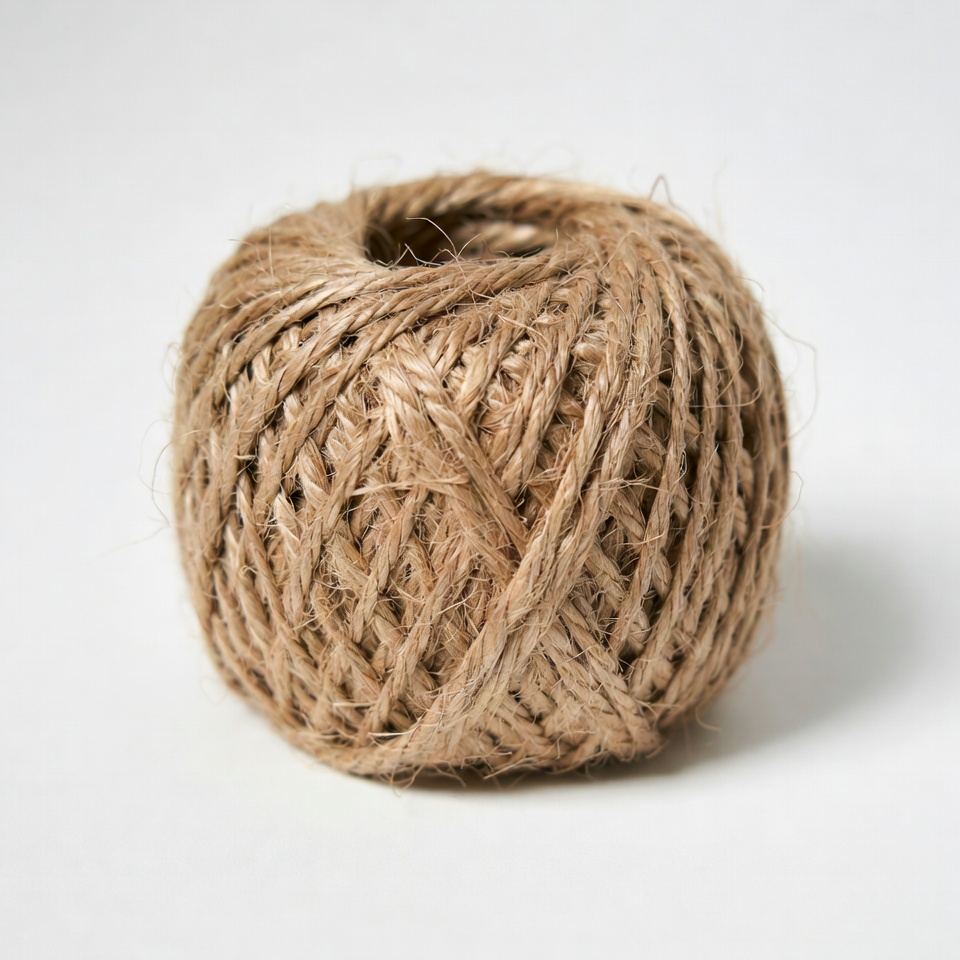 A round ball of natural brown twine sits centered on a plain white background. The twine is tightly wound with visible fibers and a slight shadow underneath. It appears textured and ready for crafting or tying.